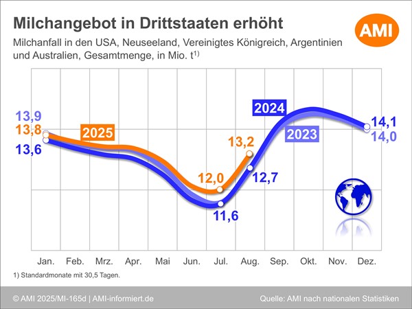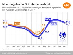 Das Milchangebot in den bedeutendsten Milcherzeugerregionen außerhalb der EU lag im bisherigen Jahresverlauf von 2025 durchgehend über der Vorjahreslinie. Von Januar bis August 2025 erzeugten die USA, Neuseeland, das Vereinigte Königreich, Argentinien und Australien insgesamt rund 104 Mio. t Milch. Im Vergleich zum Vorjahreszeitraum hat sich die Milcherzeugung der wichtigsten Drittstaaten damit um schalttagsbereinigte 2,7 % erhöht. Im Januar fiel das Milchangebot dabei um gut 1,2 % umfangreicher aus als im Vorjahresmonat. In den Folgemonaten erhöhte sich der Zuwachs sukzessive und erreichte im Juli mit knapp 4,1 % sein bisheriges Maximum. Im August hat sich das Wachstum dann leicht abgeschwächt, lag aber immer noch bei 3,5 %. Insgesamt erzeugten die USA im August rund 13,4 Mio. t Milch bzw. nach Umrechnung auf einen Standardmonat mit 30,5 Tagen rund 13,2 Mio. t Milch.