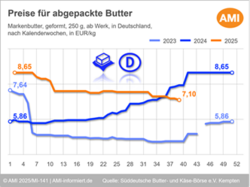 In der zweiten Septemberhälfte hat sich die Nachfrage nach geformter Butter nochmals deutlich belebt. Grund dafür war in erster Linie die Preissenkung im Lebensmitteleinzelhandel in der vergangenen Woche. Die Absätze bewegten sich auf deutlich erhöhtem Niveau und übertrafen laut nationaler Verkaufsstatistik in der 38. Kalenderwoche sowohl das bereits hohe Niveau der Vorwoche als auch das der Vorjahreswoche. Durch diesen kaum vorhersehbaren Impuls Mitte des Monats mussten Hersteller die Warenflüsse teilweise neu strukturieren, um Bestellungen weiter bedienen zu können. Die Produktion verlief derweil, bei saisonunüblich hohem Rohstoffaufkommen, umfangreich. Bei den sinkenden Fettpreisen tendierten auch die Butterpreise in der 39. Kalenderwoche leicht schwächer. Durch die belebte Nachfrage und die umfangreiche Produktion schien, dem Vernehmen nach, der Tiefpunkt allerdings erreicht zu sein. Die Butter- und Käse-Börse in Kempten senkte die Notierung für geformte Butter am 24.09.25 gegenüber der Vorwoche am unteren Spannenende um 15 Ct auf 6,85 bis 7,35 EUR/kg.