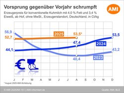 Im Sommer 2024 waren die Erzeugerpreise teils deutlich gestiegen, im August des vergangenen Jahres legten sie gegenüber dem Vormonat um 1,0 Ct zu. Durch den merklich geringeren Zuwachs in diesem Jahr hat sich der Vorsprung gegenüber dem Vorjahresmonat zuletzt verkleinert. Zu Jahresbeginn von 2025 lag dieser noch bei 8,6 Ct und hat sich im weiteren Jahresverlauf nahezu durchgängig in kleinen Schritten reduziert. Im August 2025 belief sich der Vorsprung gegenüber dem Vorjahresmonat noch auf 6,1 Ct.
