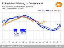 18.09.2025 (AMI) – Die bundesweite Milchanlieferung nahm Anfang September ihre saisonal rückläufige Entwicklung zwar wieder auf, überschritt aber weiterhin deutlich die Vorjahresmengen. Dadurch fiel das Angebot an den Rohstoffmärkten vergleichsweise umfangreich aus, während sich die Nachfrage verhalten zeigte.