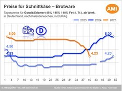 02.10.2025 (AMI) – Über den Monatswechsel herrschten am Markt für Schnittkäse vorrangig rückläufige Tendenzen vor. Die Nachfrage im Inland war überwiegend saisonüblich und konnte ausreichend von dem bestehenden Angebot gedeckt werden.