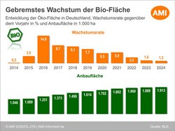 19.09.2025 (AMI) – Die ökologisch bewirtschaftete Fläche in Deutschland wächst weiter – 2024 allerdings deutlich langsamer als in den Vorjahren. Damit verschärft sich das Spannungsfeld: Die steigende Nachfrage trifft auf eine heimische Produktion, die nicht Schritt halten kann. Die AMI Marktexpertinnen geben aktuelle Einblicke in den Ökomarkt mit exklusiver Marktstudie und Experteninput aus der Umstellungsberatung.