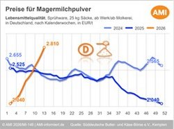 Die Butter- und Käse-Börse in Kempten hat die Spanne für Magermilchpulver in Lebensmittelqualität am 25.03.26 mit 2.720 bis 2.900 EUR/t festgestellt, womit sich der Preisanstieg weiter fortsetzte. Das untere Spannenende wurde gegenüber der Vorwoche um 70 EUR und das obere um 130 EUR heraufgesetzt.