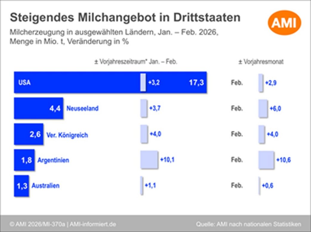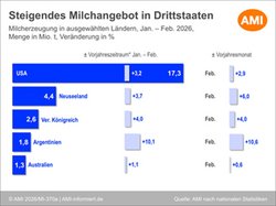 16.04.2026 (AMI) – Im Januar und Februar 2026 lieferten die Landwirte in den wichtigsten Exportländern außerhalb der EU mehr Milch an die Molkereien. Sowohl auf der Nord- als auch auf der Südhalbkugel legte das Milchaufkommen in den bedeutendsten Regionen zu. Die fünf wichtigsten Exporteure für Molkereiprodukte außerhalb der EU-27 erfassten im Februar 2026 nochmals mehr Milch als im Vorjahresmonat. Insgesamt produzierten die USA, Neuseeland, das Vereinigte Königreich, Argentinien und Australien knapp 13,0 Mio. t Milch. Im Vergleich zu Februar 2025 bedeutete das eine Mehrmenge von nahezu 476 Tsd. t oder 3,8 %. In der Kumulation der ersten beiden Monate von 2026 ergab sich in den fünf Drittländern eine Produktionsmenge von 27,5 Mio. t und damit ein Plus von 3,7 % gegenüber dem Vorjahreszeitraum.