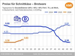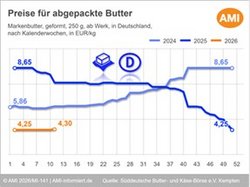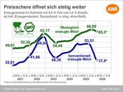 05.03.2026 (AMI) – Die Milcherzeuger in Deutschland mussten zu Beginn des neuen Jahres massive Einbußen beim Milchgeld hinnehmen. Damit hat sich der Abwärtstrend der Preise für konventionell erzeugte Kuhmilch kurzfristig verstärkt.
