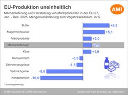 19.03.2026 (AMI) – Die Milchanlieferung innerhalb der EU-27 bewegte sich 2025, insbesondere im letzten Quartal, deutlich über dem Vorjahresniveau. Dadurch stand vor allem in erzeugerstarken Regionen oftmals mehr Rohstoff zur Weiterverarbeitung zur Verfügung. Die stärksten Produktionssteigerungen waren bei Butter und Magermilchpulver zu verzeichnen.