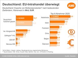 12.03.2026 (AMI) – Der deutsche Außenhandel mit Molkereiprodukten legte im Jahr 2025 weiter zu. Die EU und insbesondere Länder in Westeuropa blieben dabei der zentrale Absatzmarkt. Käse war weiterhin das mengenmäßig wichtigste Exportprodukt der deutschen Milchwirtschaft. Deutlich zulegen konnten zudem die Ausfuhren von Magermilchpulver.