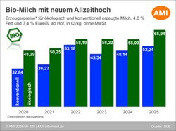 Die Erzeugerpreise für ökologisch erzeugte Kuhmilch haben im Jahr 2025 ebenfalls deutlich zugelegt. Das Bundesmittel für Bio-Milch mit 4,0 % Fett und 3,4 % Eiweiß einschließlich Nachzahlungen erhöhte sich gegenüber dem Vorjahr um 7,9 Ct/kg auf 65,94 Ct/kg. Damit wurde erstmals im Jahresdurchschnitt die 60Cent-Marke überschritten und zugleich ein neues Allzeithoch erreicht.