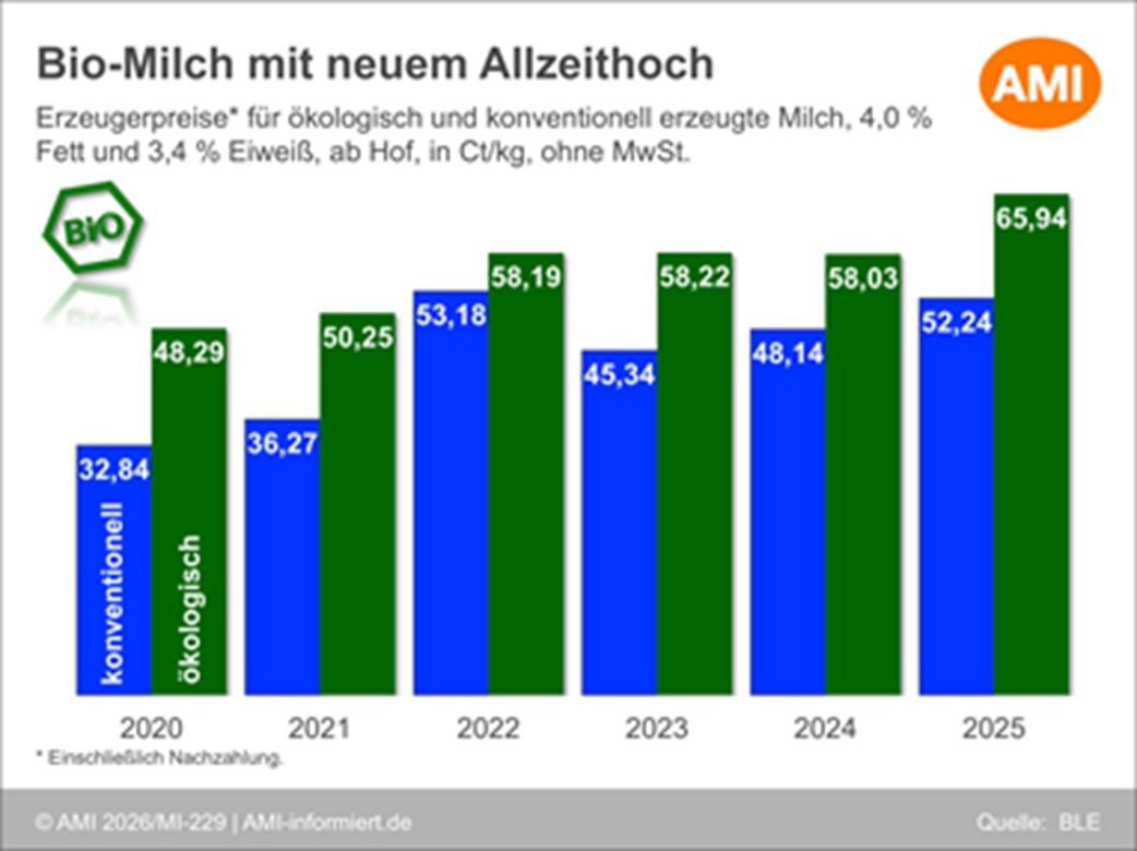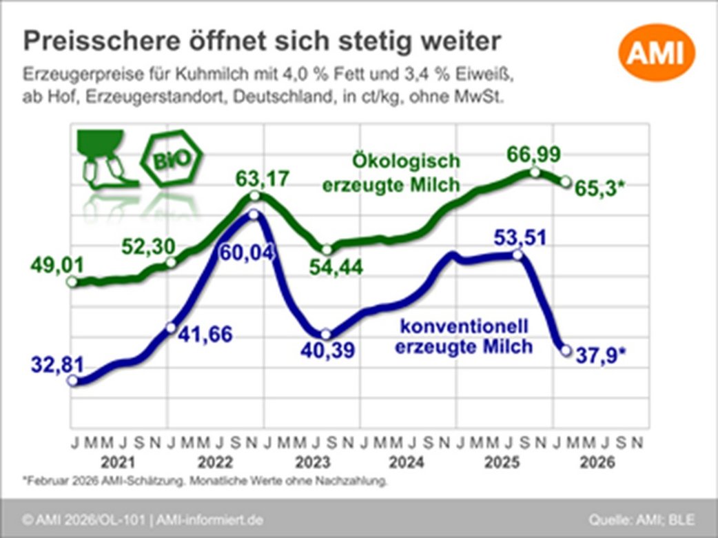 Im Februar 2026 setzten die Bio-Milchpreise im Bundesgebiet ihren Rückgang fort. Allerdings hat sich dieser im Vergleich zum Vormonat verlangsamt. Die Bio-Milchbetriebe erhielten im Februar im bundesweiten Schnitt rund 65,3 Ct/kg für ihren ökologisch erzeugten Rohstoff mit 4,0 % Fett und 3,4 % Eiweiß, so erste Hochrechnungen der AMI. Gegenüber Januar ist der Durchschnittspreis um 0,5 Ct/kg gesunken. Damit haben sich die rückläufigen Tendenzen, welche seit November 2025 das Bild bestimmen, fortgesetzt.
