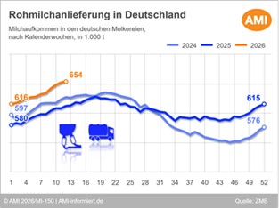 02.04.2026 (AMI) – Das Milchaufkommen in Deutschland legte in der zweiten Märzhälfte saisonal weiter zu, allerdings nicht mehr in dem Umfang wie zu Monatsbeginn. Durch die hohen Milchmengen stießen die Verarbeitungskapazitäten zunehmend an ihre Grenzen.