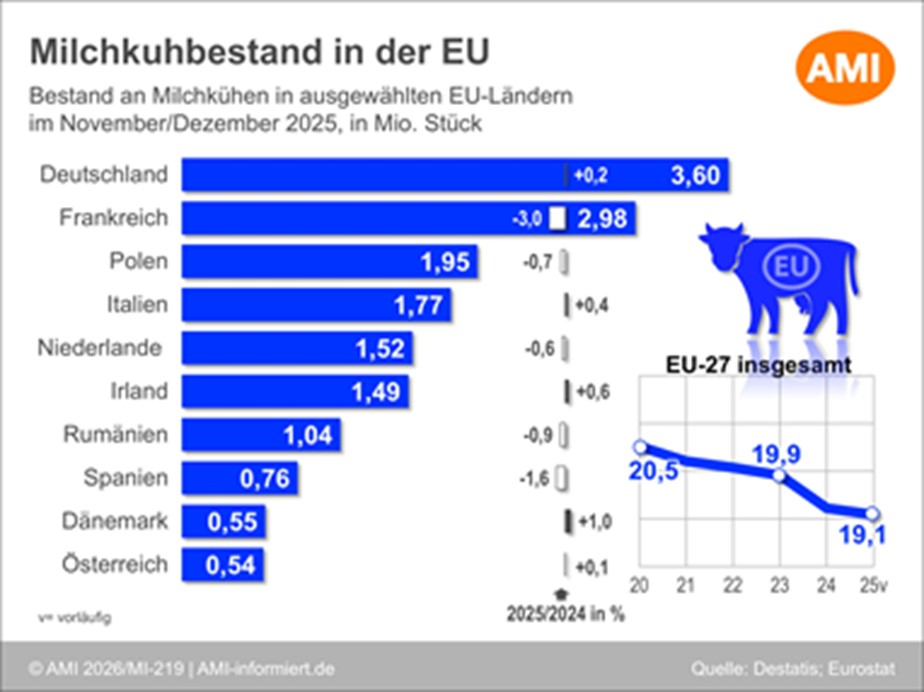 26.03.2026 (AMI) – In den Mitgliedstaaten der EU-27 entwickelten sich die Bestände von Milchkühen im Jahr 2025 uneinheitlich. In der Summe ergab sich dadurch ein kleineres Minus als im Jahr zuvor, der Abwärtstrend der Kuhzahlen setzte sich aber weiter fort.