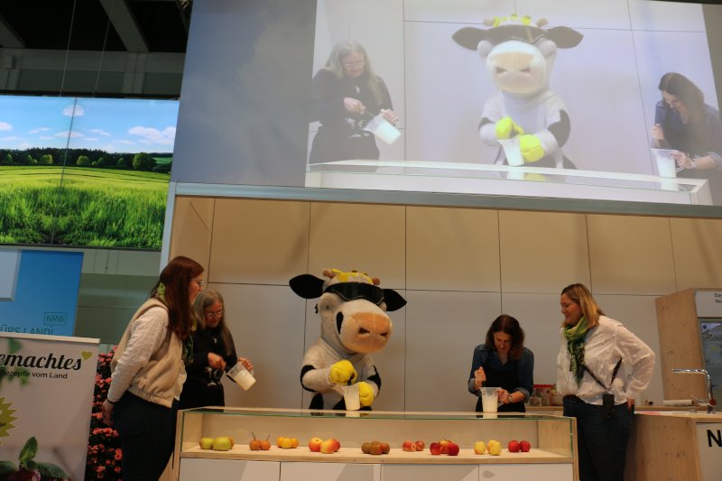 Das NRW-Milchmaskottchen Kuh Lotte bereicherte das Bühnenprogramm neben Tanzeinlagen mit einem „Sahneschlag-Wettbewerb“ und war als Milchbotschafterin in der Halle unterwegs. Sie ist seit jeher eines der beliebtesten Fotomotive bei den Besuchern der NRW-Halle.