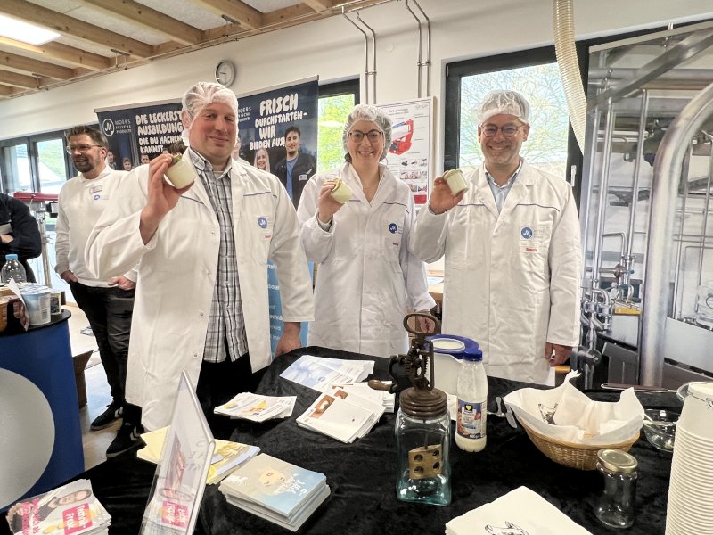 Gemeinsam mit der Landwirtschaftskammer NRW und der Moers Frischeprodukte GmbH & Co. KG beteiligte sich die LV Milch jetzt mit einem Stand an der Ausbildungsmesse der Sekundarschule an der Dorenburg in Grefrath. Die drei Kooperationspartner stellten Ausbildungsberufe in der Milchwirtschaft bzw. der Landwirtschaft vor. Die Messe, die zusammen mit der Wirtschaftsförderung der Gemeinde Grefrath organisiert wurde, diente der Berufsorientierung der rund 120 Schülerinnen und Schüler der 8. und 9. Klassen. In der Werkhalle der Schule konnten sie sich gemeinsam mit ihren Lehrern bei insgesamt 28 Ausstellern zu Ausbildungswegen und möglichen Berufsfeldern informieren. Viele Jugendliche nutzten am Stand der LV Milch begeistert das Angebot, selbst Butter herzustellen. Auch der Bürgermeister der Gemeinde Grefrath Stefan Schumeckers, sowie die Wirtschaftsförderin Laura Bürkert und RLV-Kreisverbandsvorsitzender Christoph Tenhaef traten zum Wettbuttern an und hatten sichtlich Spaß an der Aktion.