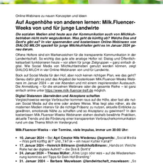 Vergleichsweise wenige Verbraucher kommen raus auf die Höfe, aber fast alle nutzen Social Media auf die eine oder andere Weise. Was liegt also näher, als die modernen Medien intensiv für die richtige Präsenz zu nutzen, aktuelle Einblicke zu gewähren, emotionale Nähe zu schaffen und so Akzeptanz zu gewinnen? In den kostenlosen Milk.Fluencer-Weeks Webinaren stehen deshalb bewährte Praktiken, aktuelle Trends und die Förderung einer transparenten Verbraucherkommunikation rund um das Thema Milch im Vordergrund.