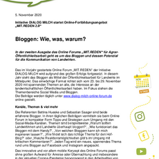 DIALOG MILCH wird aufgrund des großen Erfolgs fortgesetzt. In diesem Jahr steht das Bloggen als Mittel der Öffentlichkeitsarbeit für Landwirte im Mittelpunkt. Das einwöchige Format richtet sich vom 23. bis 29. November 2020 mit spannenden Themen an alle, die Interesse an der landwirtschaftlichen Öffentlichkeitsarbeit haben. Im Fokus stehen die Themenbereiche Social Media und Bloggen.
