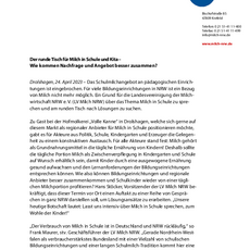 „Der Verbrauch von Milch in Schule ist in Deutschland und NRW rückläufig,“ so Frank Maurer, stv. Geschäftsführer der LV Milch NRW. „Gerade Nordrhein-Westfalen als verbraucherstärkstes Bundesland mit einer Vielzahl von schulischen Bildungseinrichtungen und einer langen Schulmilch-Tradition kommt hier eine besondere Verantwortung zu,“ betont MdB Florian Müller. Für Bianca Winkel-mann, MdL NRW, ist es wichtig, dass in Ergänzung zu einem Milchangebot in Schule insbesondere die Ernährungsbildung mit dem Ziel, Ernährungskompetenzen zu vermitteln, im Fokus steht. Auch Jochen Ritter, MdL NRW, bekräftigt, dass gerade mit Blick auf die Nachhaltigkeitsthemen ein Austausch zwischen