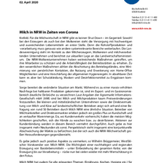 -verarbeitung muss genauso wie andere systemrelevante Bereiche weiterlaufen. Die Landesvereinigung steht im Kontakt zu den Milcherzeugern, Molkereien und milchverarbeitenden Unternehmen und berichtet zur aktuellen Lage an das Landwirtschaftsministerium. Die NRW-Molkereiunternehmen haben weitreichende Maßnahmen getroffen, um ihre Mitarbeiter zu schützen und die Arbeitsfähigkeit der Betriebsstätten zu erhalten. Zu den wesentlichen Maßnahmen zählen die Abschottung des Betriebsgeländes, eine Minimierung von persönlichen Kontakten, die Nutzung und Erweiterung von Home-Office Möglichkeiten und eine Verschärfung der allgemeinen Hygieneregeln. In absehbarer Zeit kann es aber bei Schutzkleidung, Masken und Desinfektionsmittel zu Engpässen kommen.