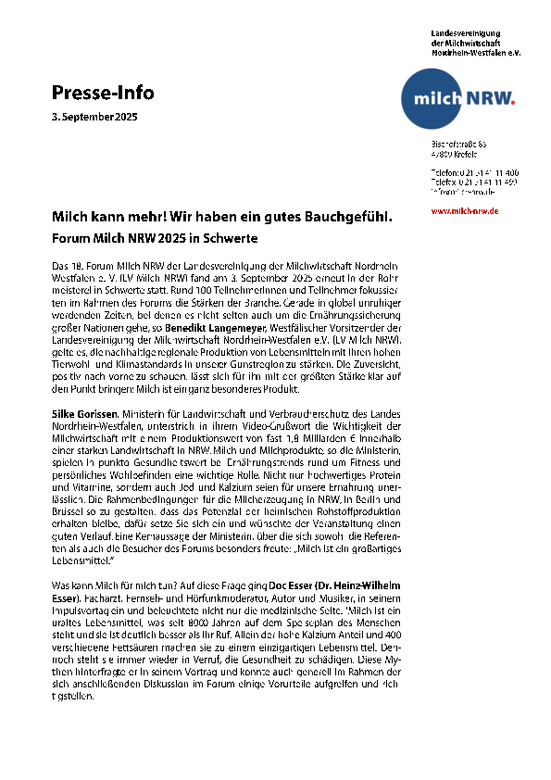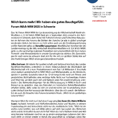 Das 18. Forum Milch NRW der Landesvereinigung der Milchwirtschaft Nordrhein-Westfalen e. V. (LV Milch NRW) fand am 3. September 2025 erneut in der Rohrmeisterei in Schwerte statt. Rund 100 Teilnehmerinnen und Teilnehmer fokussierten im Rahmen des Forums die Stärken der Branche. Gerade in global unruhiger werdenden Zeiten, bei denen es nicht selten auch um die Ernährungssicherung großer Nationen gehe, so Benedikt Langemeyer, Westfälischer Vorsitzender der Landesvereinigung der Milchwirtschaft Nordrhein-Westfalen e.V. (LV Milch NRW), gelte es, die nachhaltige regionale Produktion von Lebensmitteln mit ihren hohen Tierwohl- und Klimastandards in unserer Gunstregion zu stärken. Die Zuversicht, positiv nach vorne zu schauen, lässt sich für ihn mit der größten Stärke klar auf den Punkt bringen: Milch ist ein ganz besonderes Produkt.