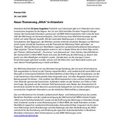 Das vom Ministerium für Umwelt, Landwirtschaft, Natur- und Verbraucherschutz des Landes Nordrhein-Westfalen und der Landesvereinigung der Milchwirtschaft NRW initiierte Projekt „Milch macht Ku(h)lturlandschaft“ wurde mit der Eröffnung des Milchwegs in Attendorn fortgesetzt. Erarbeitet wurde er unter Mitwirkung der LV Milch NRW, der Stadt Attendorn und des Westfälisch-Lippischen Landwirtschaftsverbandes, Kreisverband Olpe. Insgesamt sind es dann neun Milchwege (sechs Wanderwege und drei Radwege), die über die Bedeutung der Milchwirtschaft für die Entstehung und Erhaltung der typischen Kulturlandschaften in Nordrhein-Westfalen informieren. Mehr Informationen zu den NRW-Milchwegen unter www.kuhlturlandschaft.de.