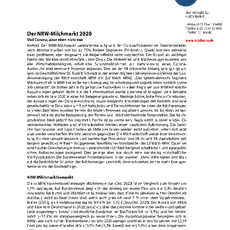 Die in NRW konventionell erzeugte Milchmenge (Jan.-Okt. 2020) ist im Vergleich zum Vorjahr um 1,7% gestiegen. Auf Bundesebene zeigt sich der Anstieg mit einem Plus von nur 0,3% deutlich moderater. Bei Butter und Milchfett ist zu beobachten, dass diese im Jahresverlauf bis Oktober als durchaus stabil zu bezeichnen sind, wenn auch preislich rund 7 % unter dem Vorjahresniveau. Butter (250 g, als Handelsmarke) lag im Schnitt bei 1,42 € (Jan.-Okt. 2020). Der Absatz von Milch und Käse ist in Deutschland in 2020 (Jan.-Okt.) über das gesamte Sortiment der weißen und gelben Linie angestiegen. Erneut sind deutliche Zuwächse bei Bio-Trinkmilch (+15,5%) und bei Weidemilch (+17,9%) im Vorjahresvergleich zu verzeichnen. Die Auszahlungspreise bewegten sich in NRW - wie auch auf der Bundesebene – im Jahr 2020 weniger volatil als in den Vorjahren: mit 32,19 Cent pro kg konventioneller Milch (4,0% Fett/3,4% Eiweiß) leicht (-1,4%) unter dem Vorjahresniveau.