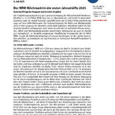 Die Milchanlieferung in NRW ist im Zeitraum Januar bis April im Vergleich zum Vorjahreszeitraum um 4 % deutlich zurückgegangen. Insgesamt ist in Deutschland in diesem Zeitraum die Milchanlieferung ebenfalls rückläufig (-2,9 %); sogar in der EU (-0,3 %) ist im Zeitraum Januar bis April ein leichter Rückgang zu beobachten. Weltweit hingegen hat das Milchaufkommen in Nordamerika (+1,2 %), Südamerika (+6,8 %) und Ozeanien (+0,5 %) zugenommen. Die Notierungsergebnisse zeigen sich im ersten Quartal 2025 bei Butter und Käse unbeständig und tendenziell leicht fallend. Bei Magermilchpulver sind die Ergebnisse ebenfalls rückläufig. Trotz höherer Verbraucherpreise ist in den ersten Jahresmonaten der Absatz konventioneller Konsummilch um 2,7 % gestiegen; bei Biomilch deutlich um 5,6 %. Die Erzeugerpreise mit 52,45 Cent/kg für konventionell erzeugte Milch (4 % Fett, 3,4 % Eiweiß) rangieren in NRW im ersten Quartal mit einem Plus von 21,6 % gegenüber dem Vorjahr auf Rekordniveau. Für die Biomilcherzeugung ist mit einem Auszahlungspreis von im Mittel 60,87 Cent/kg die Situation mit 14,8 % über dem Vorjahr ähnlich. Diese guten Milchpreise verhindern aber nicht den anhaltenden Strukturwandel, denn mittlerweile scheiden auch größere Milchviehbetriebe aus der Produktion aus. Gründe hierfür sind u.a. der Generationswechsel, hohe bürokratische Hürden und deutlich gestiegene Kosten.