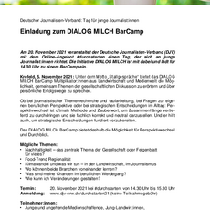 Journalist:innen richtet. Die Initiative DIALOG MILCH ist mit dabei und lädt für 14.30 Uhr zu einem BarCamp ein.