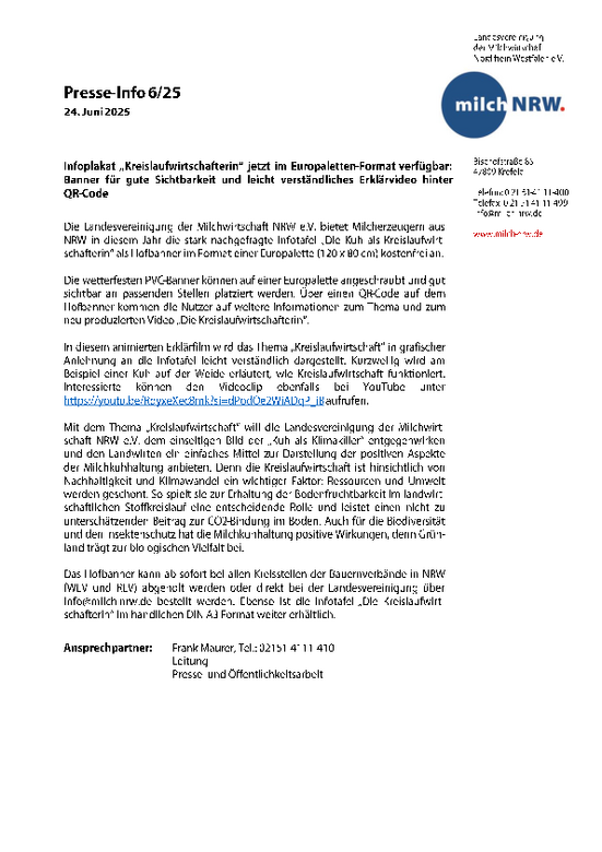 Das Hofbanner kann ab sofort bei allen Kreisstellen der Bauernverbände in NRW (WLV und RLV) abgeholt werden oder direkt bei der Landesvereinigung über info@milch-nrw.de bestellt werden. Ebenso ist die Infotafel „Die Kreislaufwirtschafterin“ im handlichen DIN A3-Format weiter erhältlich.