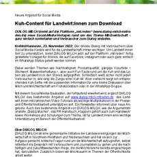 Mit diesem Social-Media-Baukasten, der fortlaufend erweitert wird, ergänzt DIALOG MILCH das bestehende Angebot auf www.dialog-milch-mitreden.de, das Landwirt:innen mit zahlreichen Video-Tutorials als wichtige Multiplikatoren in der Presse- und Öffentlichkeitsarbeit unterstützen soll. Ein Newsletter informiert über neue Angebote. Auch das bestehende Angebot von DIALOG MILCH, wie die Argumentationshilfe „Dialog.Macher“, das PR-Handbuch „Klappern gehört auch zum Handwerk“ sowie Workshops und Schulungen zum Thema, ist für Landwirt:innen eine wichtige Unterstützung im Bereich der Öffentlichkeitsarbeit.