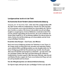 Gütersloh, den 18. November 2024 – Unter dem Titel „Landgemachtes trifft die Tafel“ kamen erfahrene Landköchinnen, Vertreter der Tafel und Gäste in Verl zusammen, um in einem Kochduell aus Lebensmitteln der Tafel kreative Gerichte zu zaubern. Wie können Lebensmittel sinnvoll und alltagstauglich zu ausgewogenen, leckeren Mahlzeiten verarbeitet werden? Das war die zentrale Fragestellung des Kochevents, das in der Eventküche der Gustav Ehlert GmbH & Co. KG am Montag stattfand. Der Abend setzte ein starkes Zeichen für die Wertschätzung von Lebensmitteln und die Förde-rung nachhaltiger Kochideen.