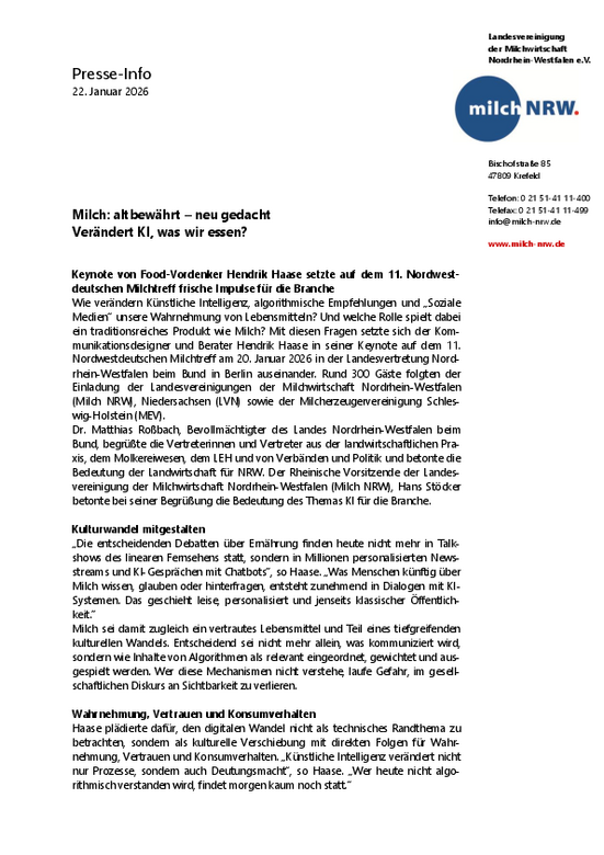 Wie verändern Künstliche Intelligenz, algorithmische Empfehlungen und „Soziale Medien“ unsere Wahrnehmung von Lebensmitteln? Und welche Rolle spielt dabei ein traditionsreiches Produkt wie Milch? Mit diesen Fragen setzte sich der Kommunikationsdesigner und Berater Hendrik Haase in seiner Keynote auf dem 11. Nordwestdeutschen Milchtreff am 20. Januar 2026 in der Landesvertretung Nordrhein-Westfalen beim Bund in Berlin auseinander. Rund 300 Gäste folgten der Einladung der Landesvereinigungen der Milchwirtschaft Nordrhein-Westfalen (Milch NRW), Niedersachsen (LVN) sowie der Milcherzeugervereinigung Schleswig-Holstein (MEV).