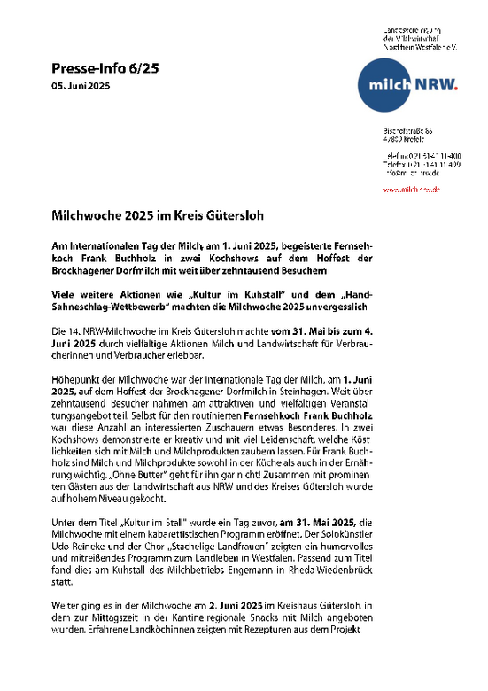 Höhepunkt der Milchwoche war der Internationale Tag der Milch, am 1. Juni 2025, auf dem Hoffest der Brockhagener Dorfmilch in Steinhagen. Weit über zehntausend Besucher nahmen am attraktiven und vielfältigen Veranstaltungsangebot teil. Selbst für den routinierten Fernsehkoch Frank Buchholz war diese Anzahl an interessierten Zuschauern etwas Besonderes. In zwei Kochshows demonstrierte er kreativ und mit viel Leidenschaft, welche Köstlichkeiten sich mit Milch und Milchprodukten zaubern lassen. Für Frank Buchholz sind Milch und Milchprodukte sowohl in der Küche als auch in der Ernährung wichtig. „Ohne Butter“ geht für ihn gar nicht! Zusammen mit prominenten Gästen aus der Landwirtschaft aus NRW und des Kreises Gütersloh wurde auf hohem Niveau gekocht.