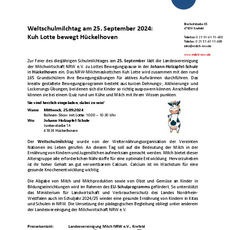 Zur Feier des diesjährigen Weltschulmilchtages am 25. September hatte die Landesvereinigung der Milchwirtschaft NRW e.V. zu Lottes Bewegungspause in der Johann-Holzapfel-Schule in Hückelhoven eingeladen. Das NRW-Milchmaskottchen Kuh Lotte führte zusammen mit den rund 165 Grundschülern ihre Bewegungsübungen für aktives Aufwärmen durch. Das kreativ gestaltete Bewegungsprogramm besteht aus kurzen Dehnungs-, Aktivierungs- und Lockerungs-Übungen, bei denen sich die Kinder sich so richtig auspowern konnten. Bei einem anschließenden Quiz rund um Kühe und Milch konnten sie mit ihrem Wissen punkten und hatten sichtlich Spaß dabei.